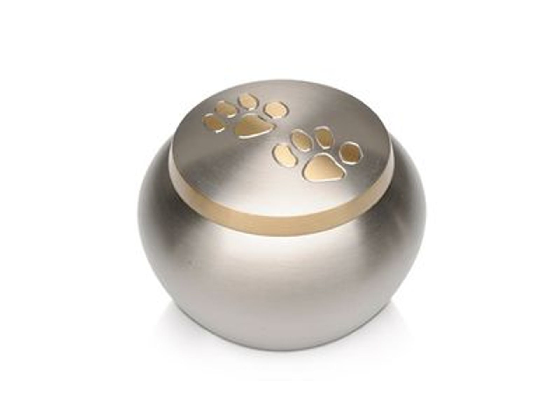 This rounded pot-shaped urn features two gold paw prints on its threaded lid.