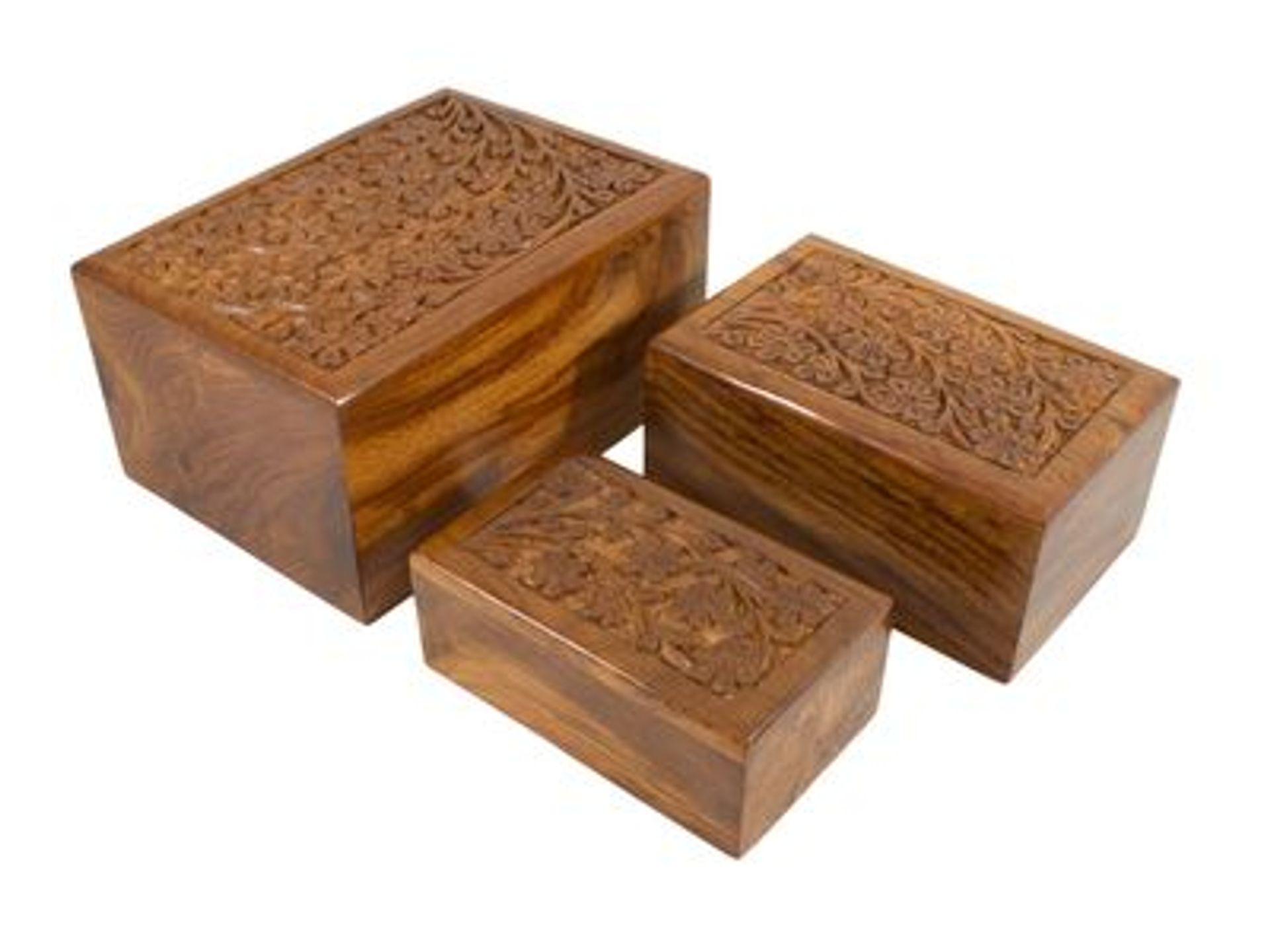 Sheesham, a sustainable alternative to the endangered Indian Rosewood, offers remarkable strength and exquisite, rich grain patterns, making it an ideal wood choice for cremation urns. Handcrafted and intricately carved by skilled artisan craftsmen in the cottage industry of Northern India, Sheesham urns embody both quality and tradition.
